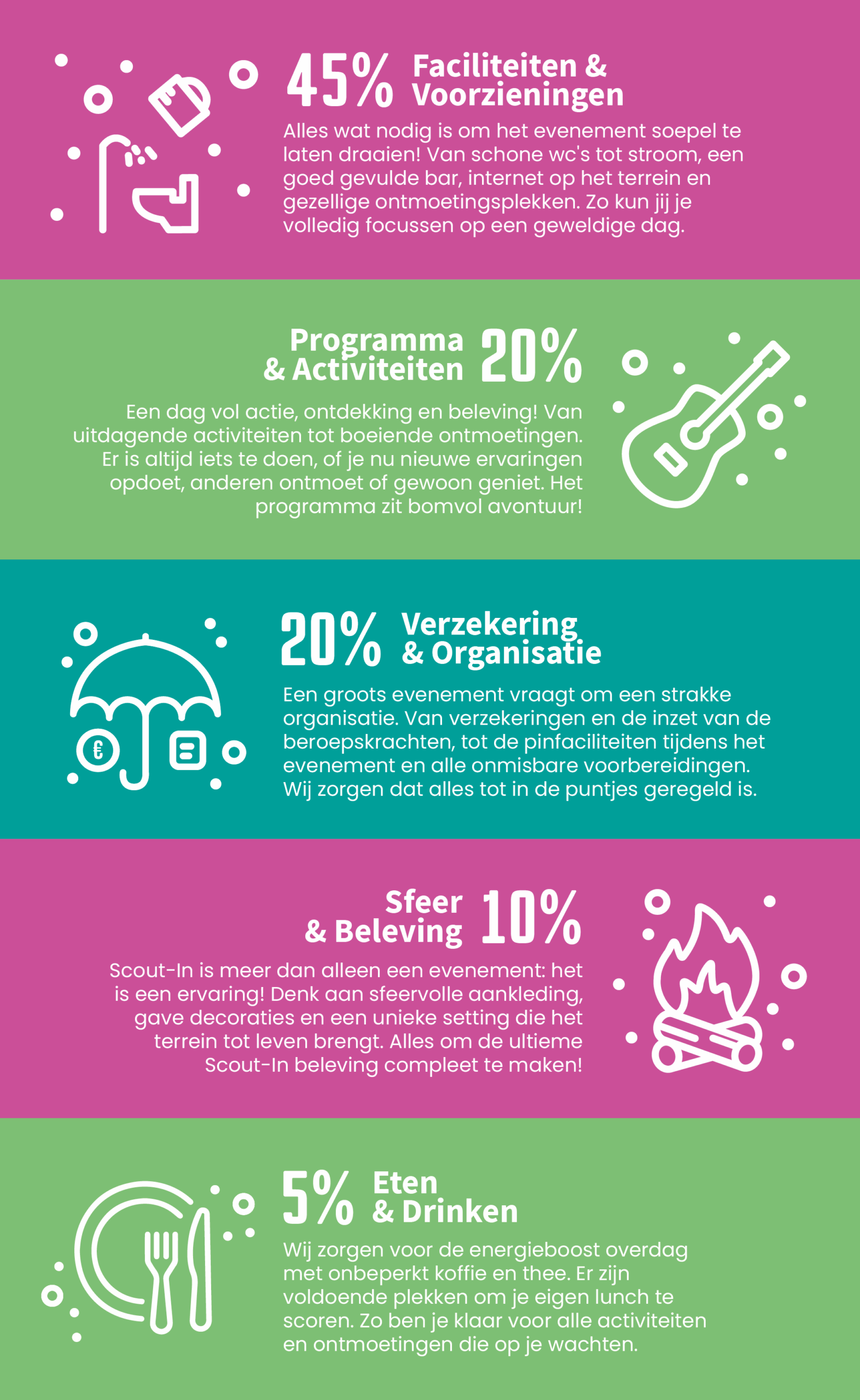 Het organiseren van een evenement brengt veel kosten met zich mee, vooral in deze tijden van stijgende prijzen. Als organisatieteam van Scout-In25 doen we ons uiterste best om voor zo weinig mogelijk geld zo veel mogelijk waarde te bieden. Op deze pagina vind je een overzicht van waar de deelnemersbijdrage aan wordt besteed.
